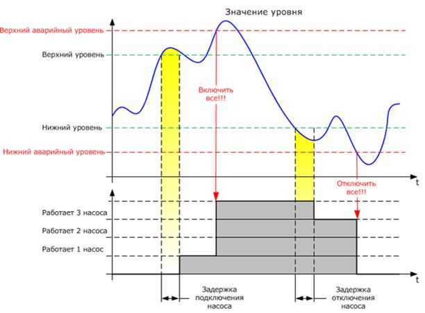 При достижении верхнего аварийного уровня (включении сигнализатора) подключаются все доступные насосы.