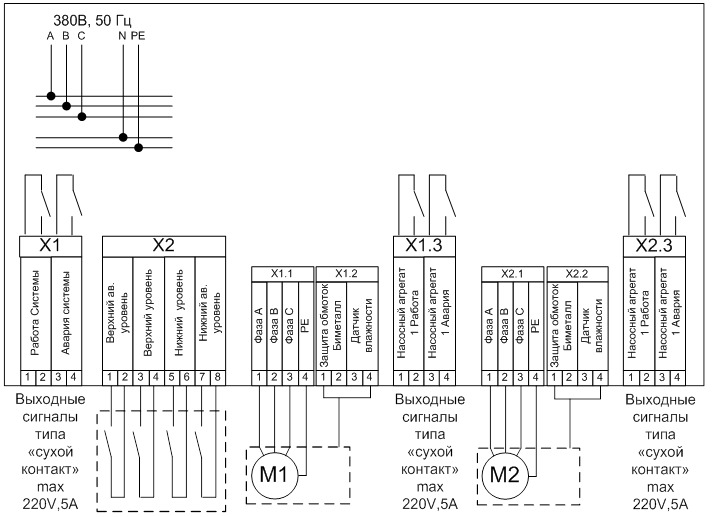 Для работы по сигнализаторам система должна быть укомплектована четырьмя поплавковыми или иными датчиками уровня: